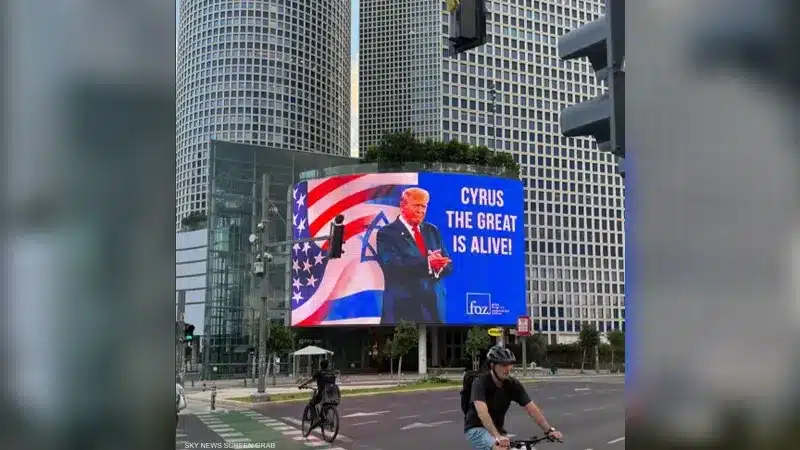 رافقت زيارة الرئيس الأميركي دونالد ترامب إلى إسرائيل حملة دعائية واسعة، تضمنت لوحات إعلانية ضخمة تمجد دوره في دعم إسرائيل، وحمايته لما تبقى من الرهائن، ومساهمته في تهدئة الأوضاع الإقليمية ومن أبرز هذه اللوحات واحدة كتب عليها بجانب صورة ترامب والعلمين الإسرائيلي والأميركي: كورش الكبير على قيد الحياة.